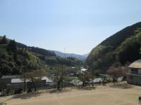 佐礼谷小学校の周りの山々は、春の穏やかな日差しの中、学校を含む谷全体を暖かく包みこんでいます。