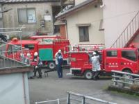 小学校体育館から出火し、付近の住宅に延焼したという想定で、小学校の職員が初期消火と通報を行い、その後、地元消防署や消防団の出動、さらに、伊予市全体の消防団が出動して、消火栓や川から取水して放水する大規模な訓練でした。